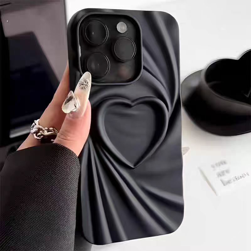 Fashion Fold Wrinkle 3D Love Heart Phone Case For iPhone 13 14 15 Pro Max 16 Plus 11 12 ProMax Soft Matte Silicone Full Cover