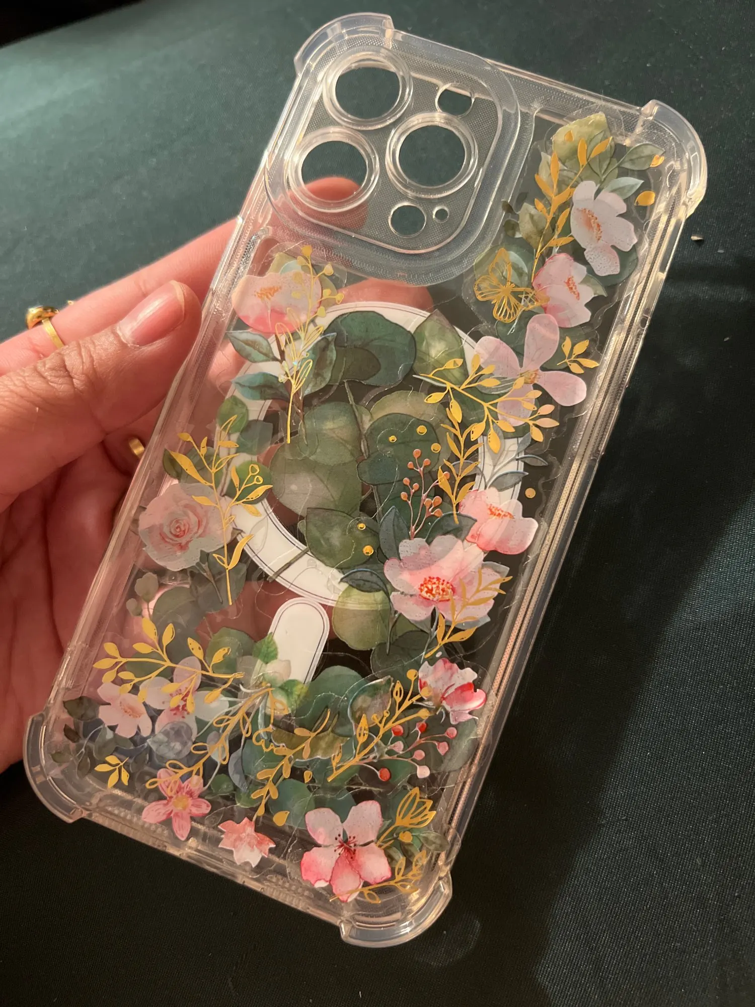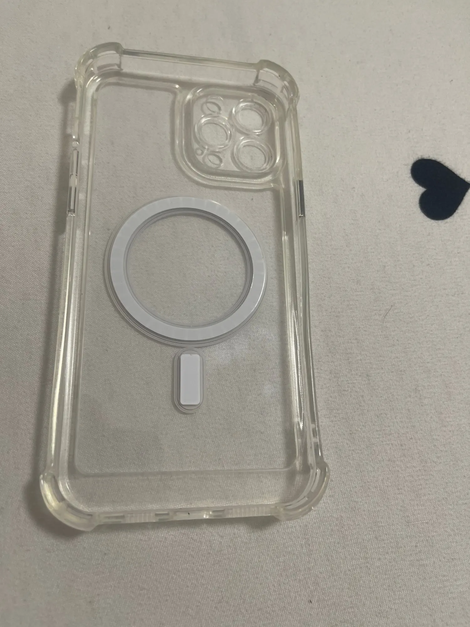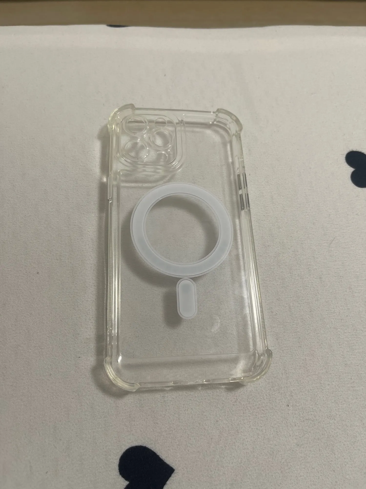 Already put stickers to dress up the plain case. Very nice solid case with corner bumpers. The back is a a hard shell and the corners are silicone. The buttons are metallic plastic but they look great. Magsafe and works with my magnetic wallet and phone accessory