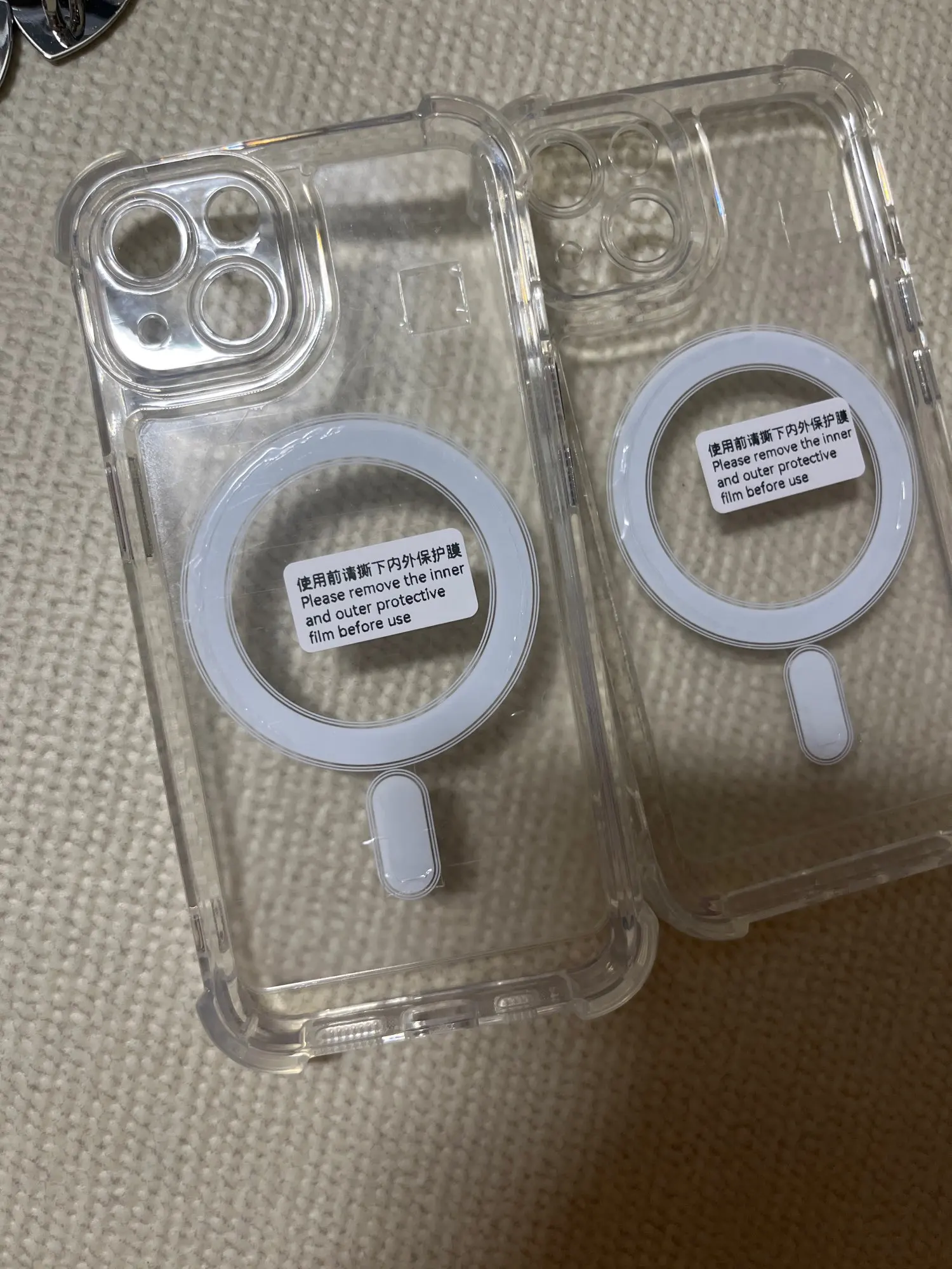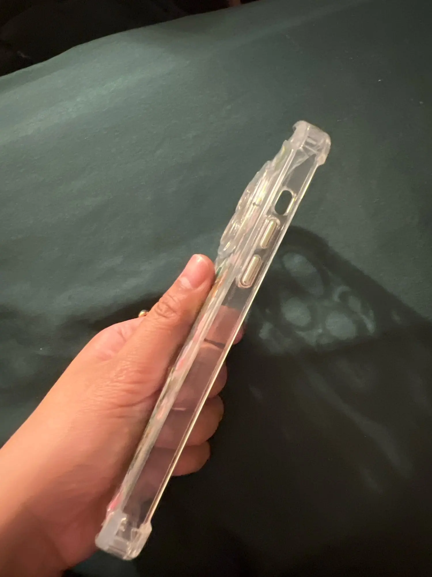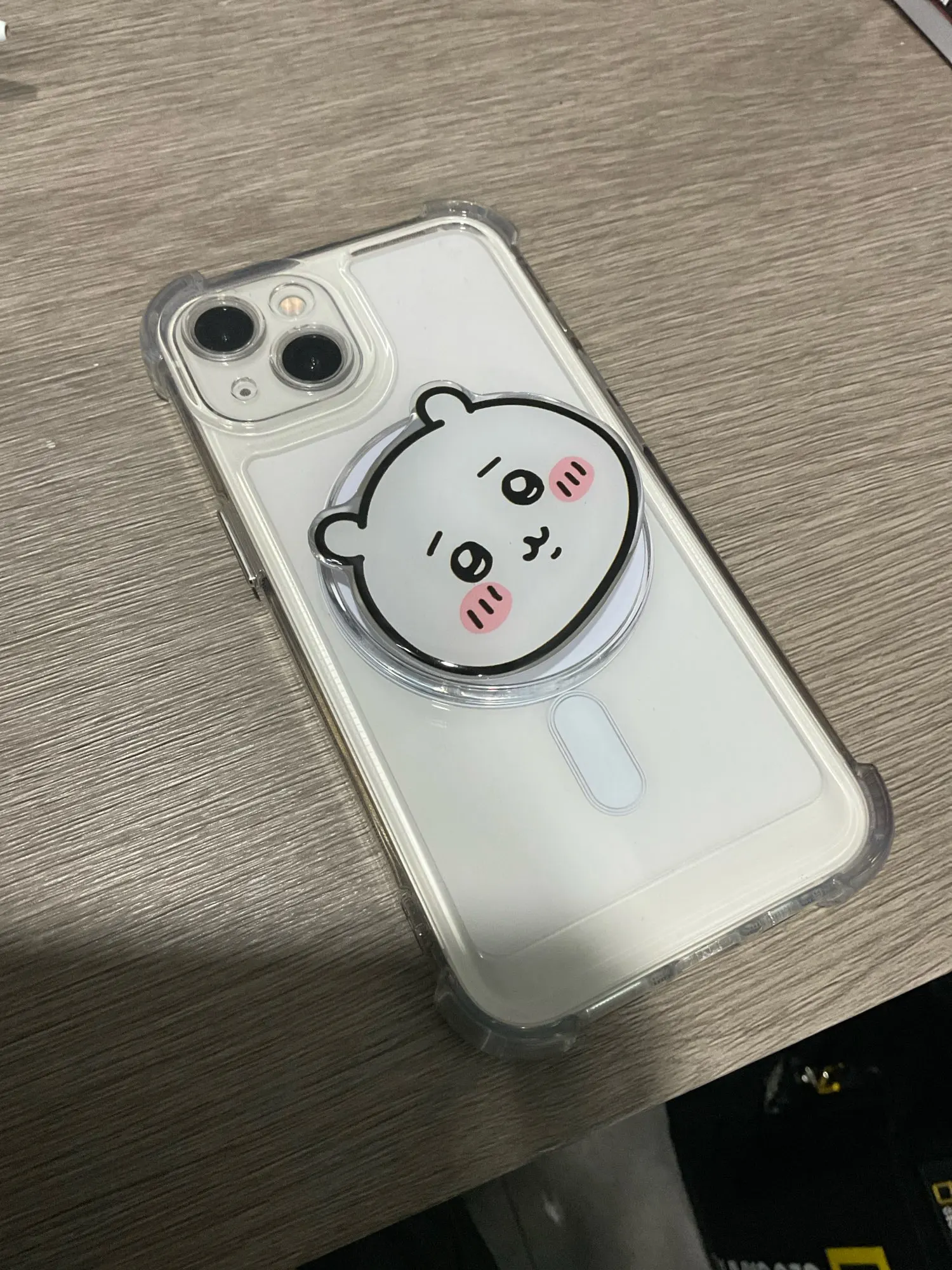 Already put stickers to dress up the plain case. Very nice solid case with corner bumpers. The back is a a hard shell and the corners are silicone. The buttons are metallic plastic but they look great. Magsafe and works with my magnetic wallet and phone accessory