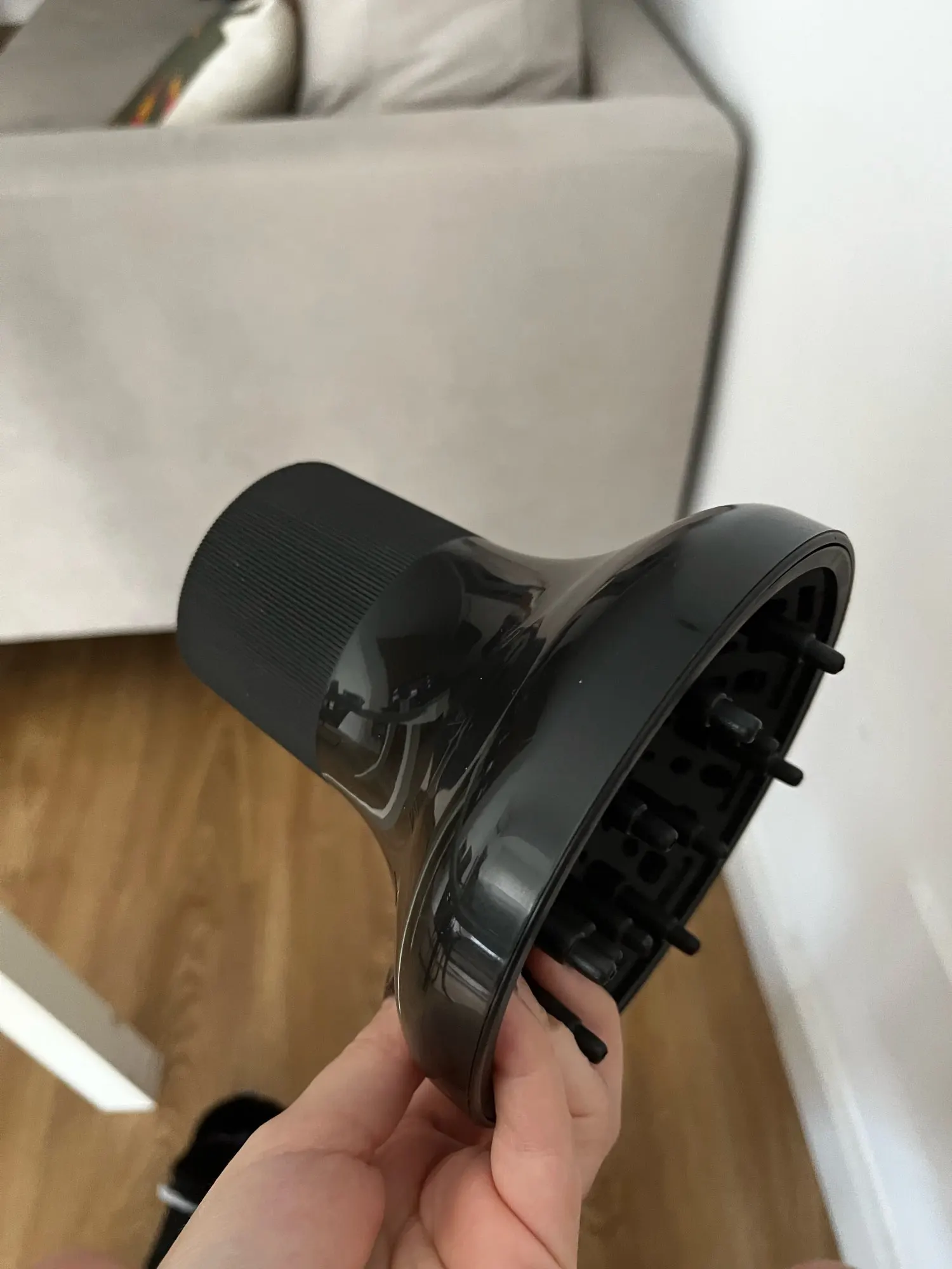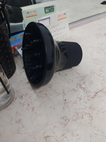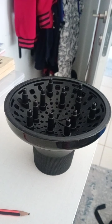 Good diffuser, made of resistant plastic and with sprinklings on the inside to fit into the hair dryer's lock. The box was in bad condition, but the product had no problem.